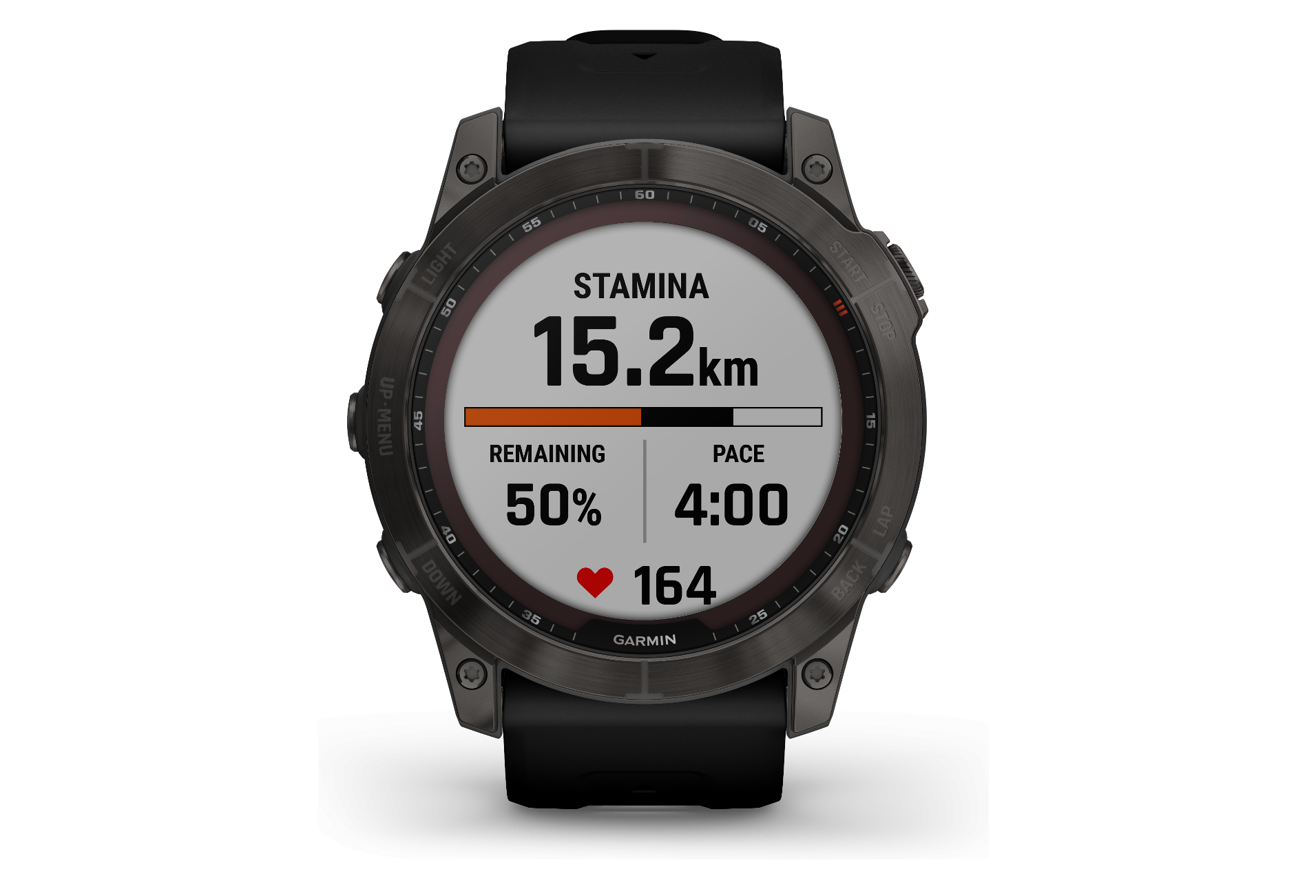 - Être vu : Mode stroboscopique unique qui correspond à votre cadence, faisant clignoter une lumière rouge lorsque la montre se balance vers l’arrière et une lumière blanche vers l’avant.